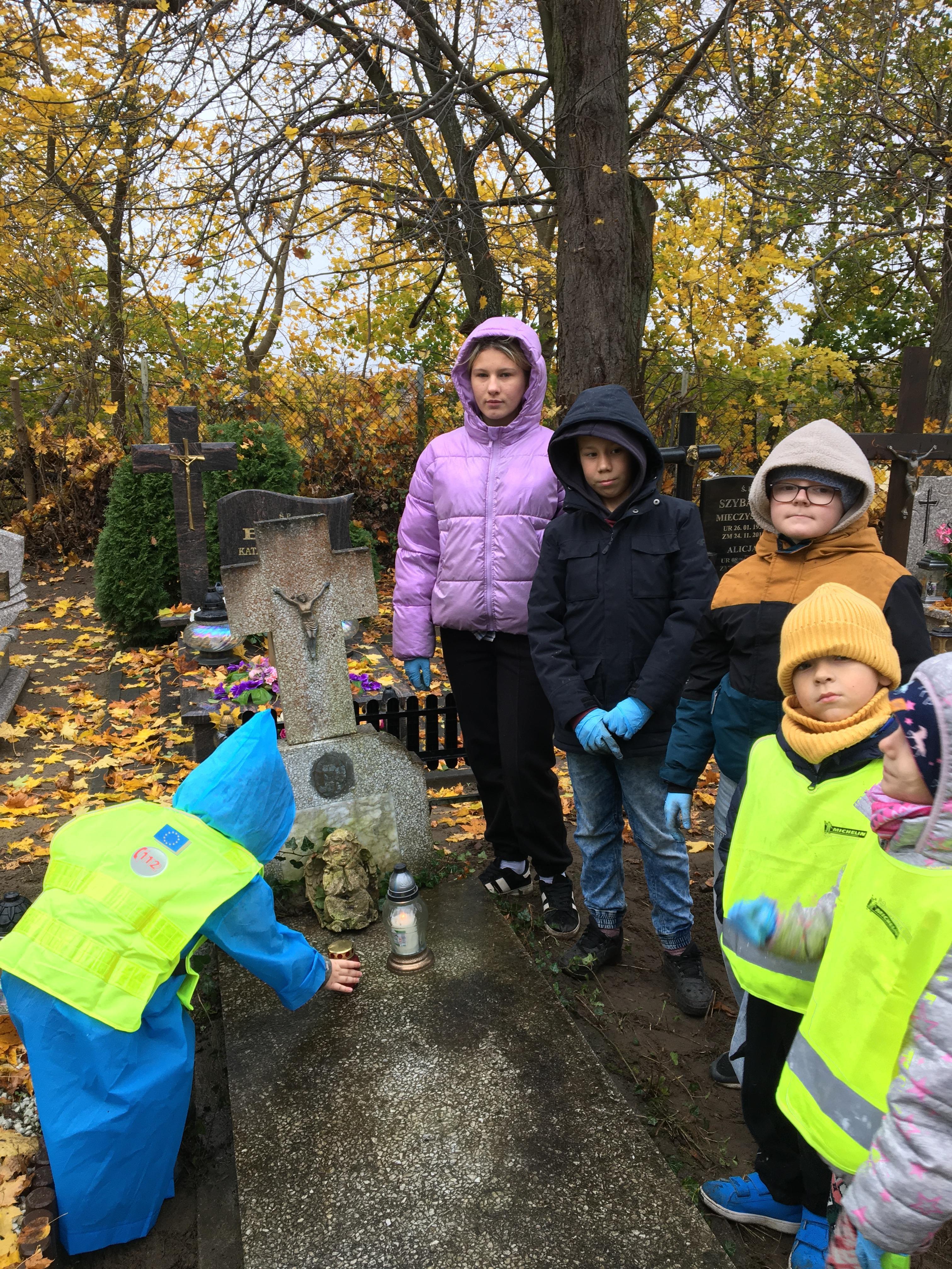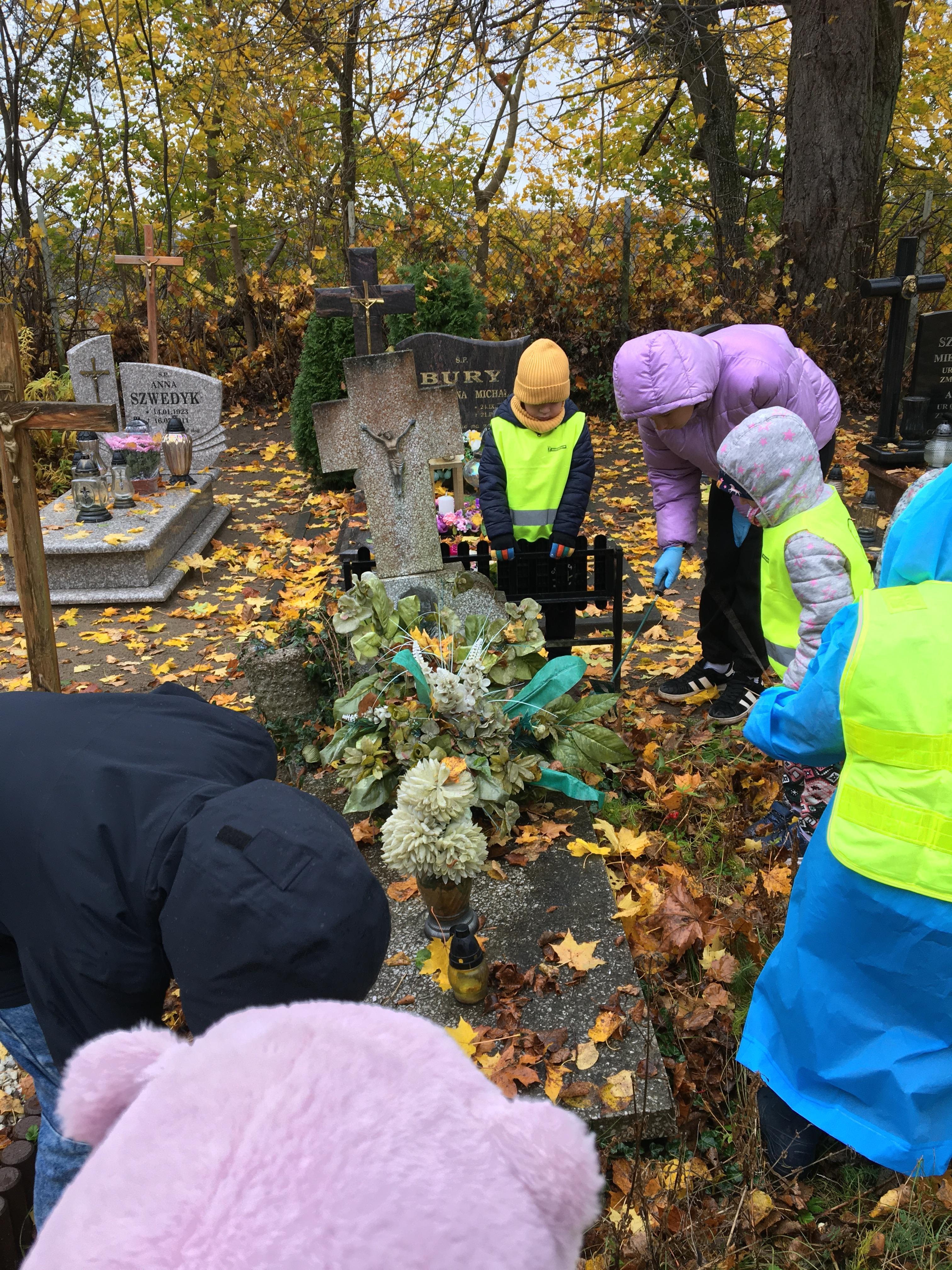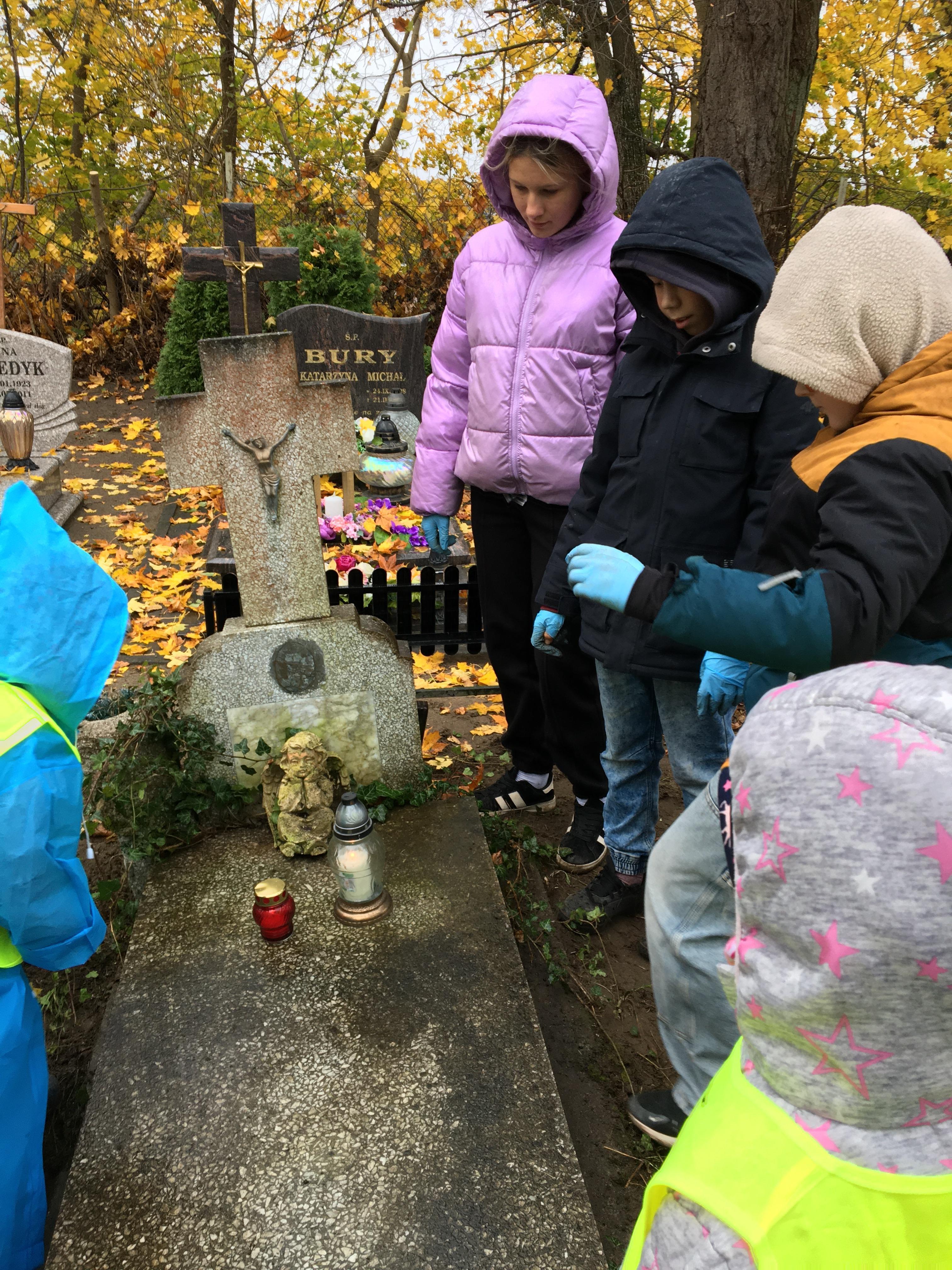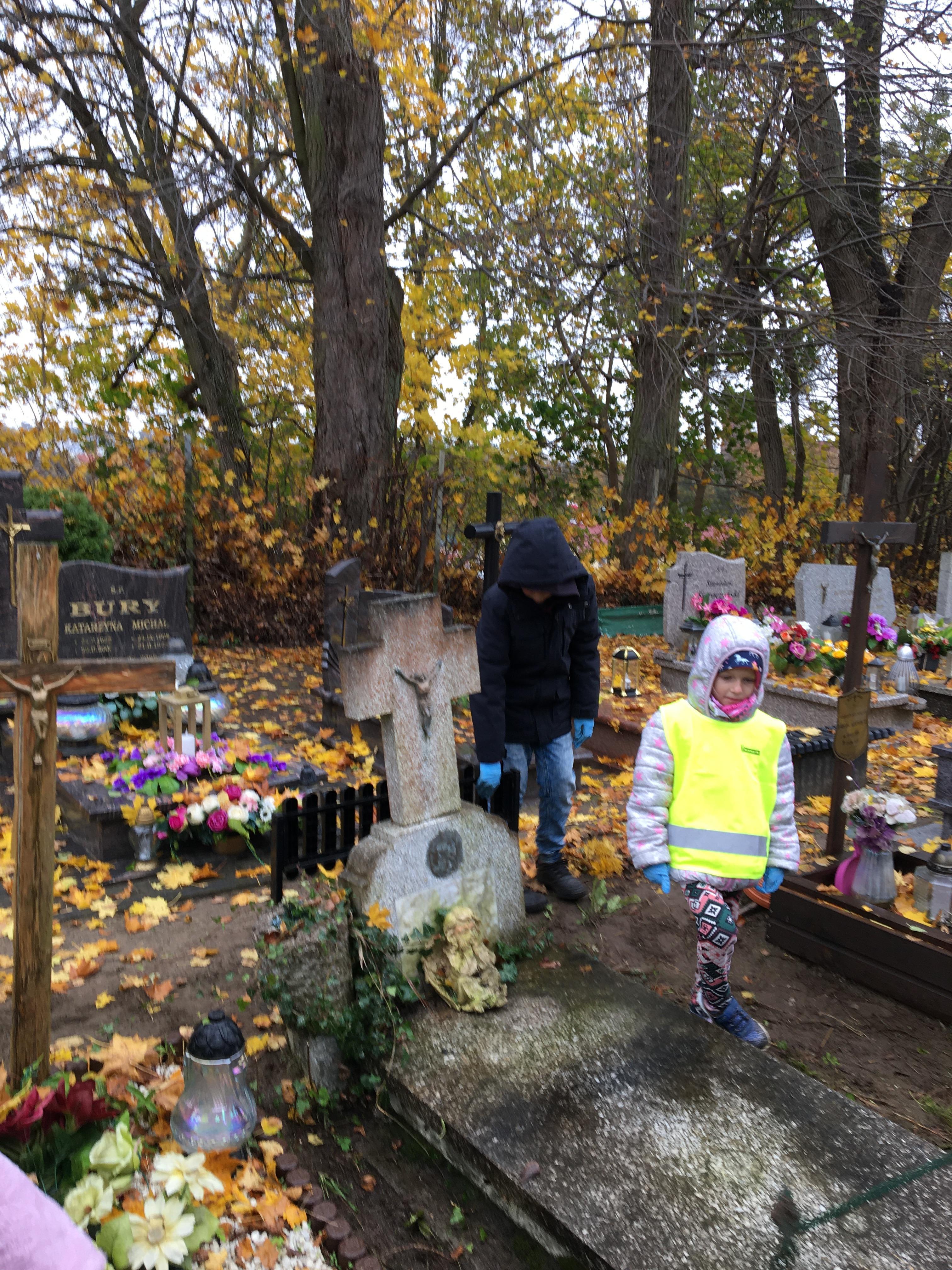 Mimo prawdziwie jesiennej aury grupa uczniów z oddziału przedszkolnego wspierana przez Ewę z klasy ósmej, Oskara z klasy czwartej oraz Adama z klasy siódmej udała się dzisiaj na cmentarz komunalny w Dobrym Mieście, by odnaleźć i uporządkować zapomniany grób i zapalić na nim symboliczny znicz symbolizujący pamięć o tych, którzy odeszli. Postanowiliśmy, iż otoczymy opieką właśnie ten grób z figurką siedzącego aniołka i dawno zatartymi przez czas literami. Chcemy wrócić tutaj wraz z nadejściem wiosny. W drodze powrotnej czas oczekiwania na autobus spędziliśmy w bibliotece CKB, gdzie nawet najmłodsi uczestnicy wyjazdu próbowali swych sił w składaniu literek. I tak potrzebne i pożyteczne połączyło się z przyjemnym.