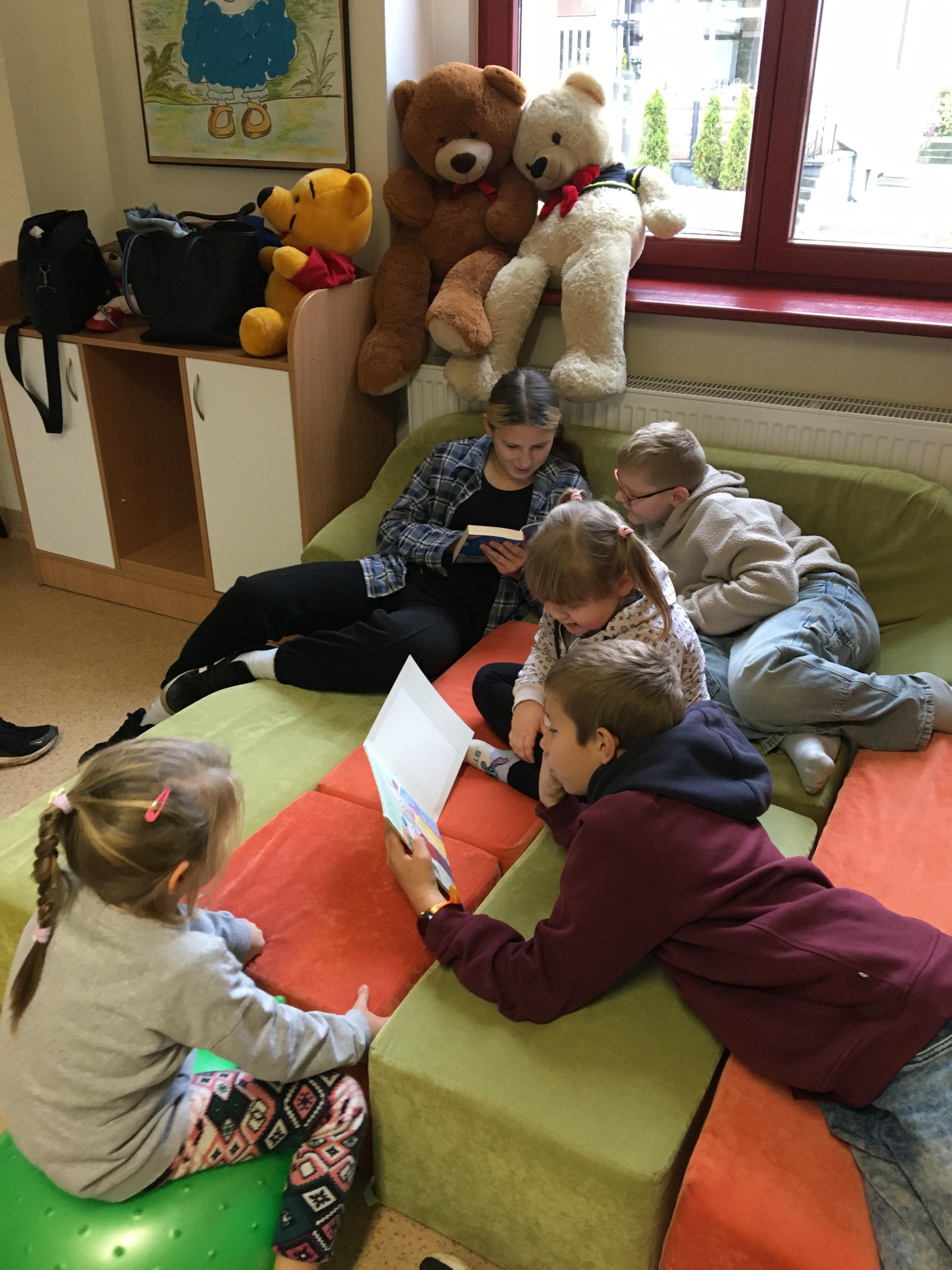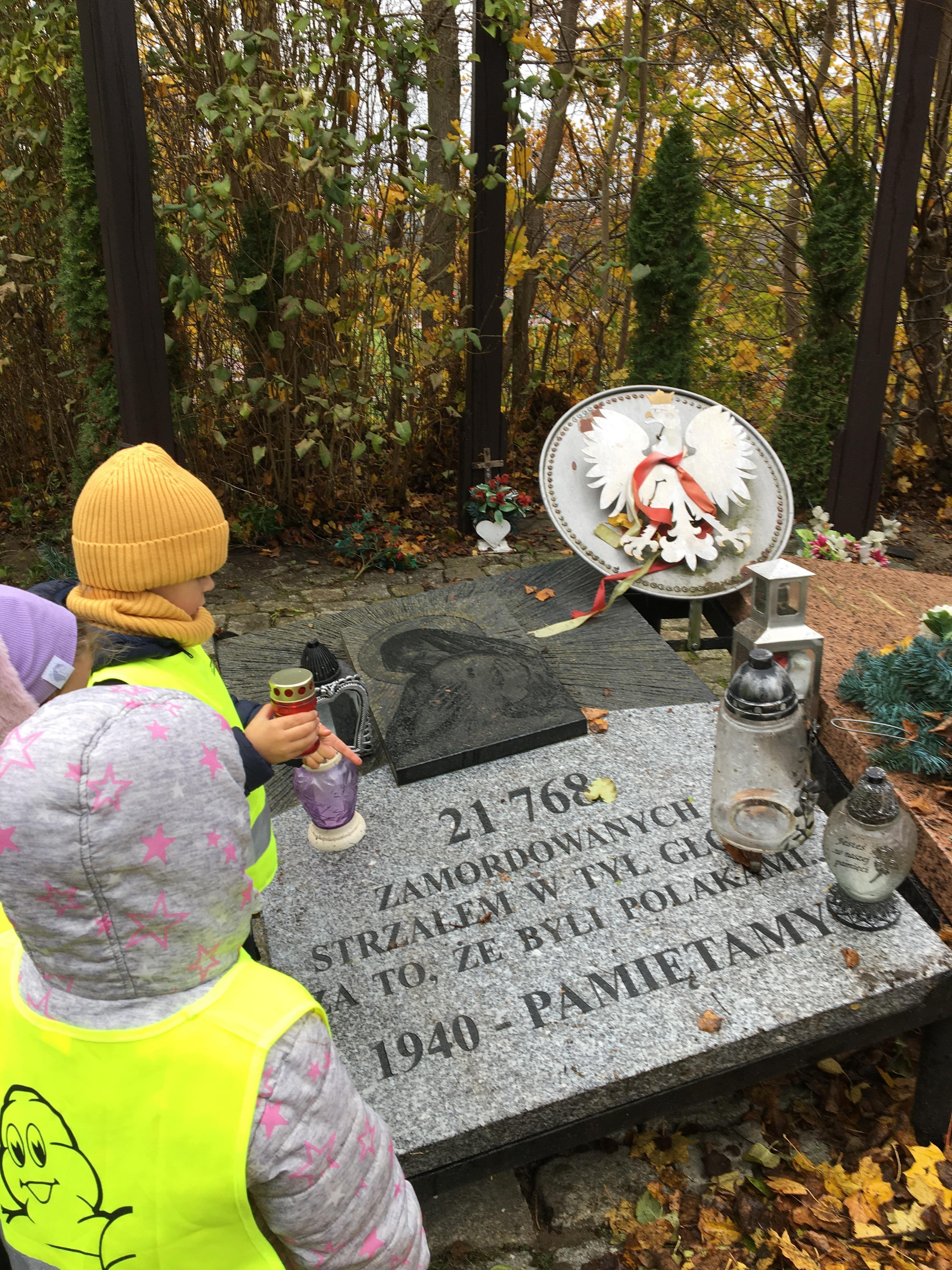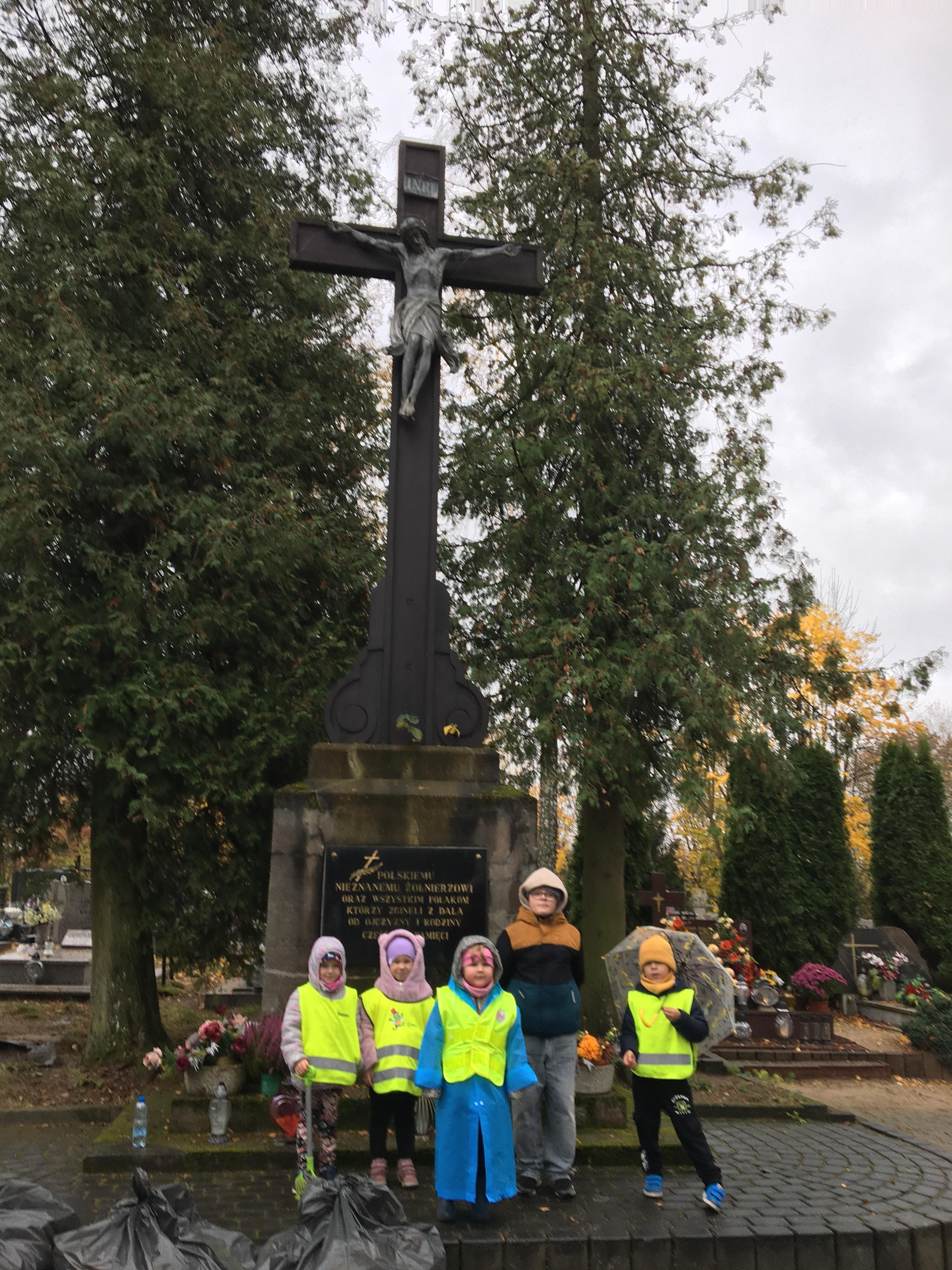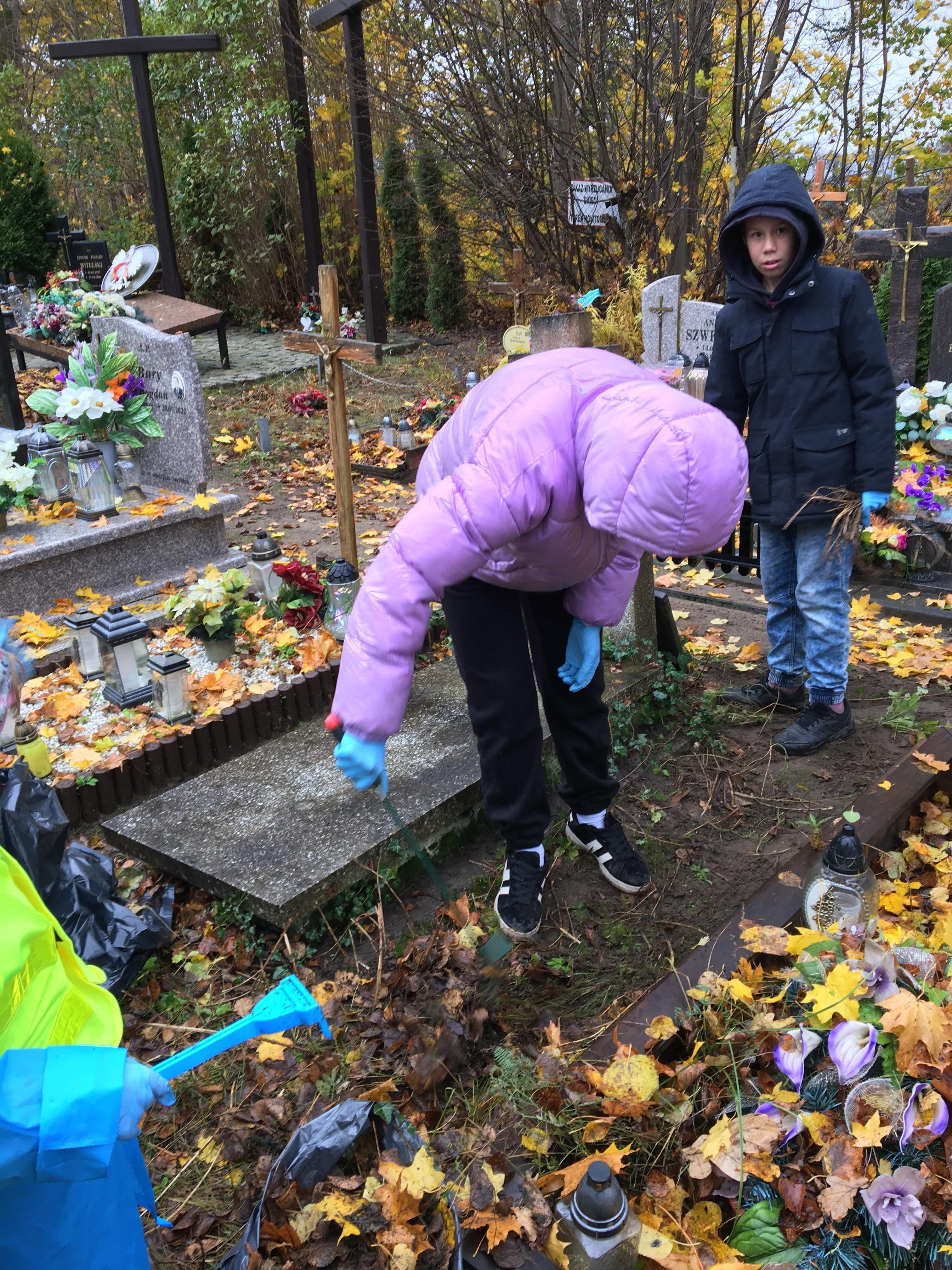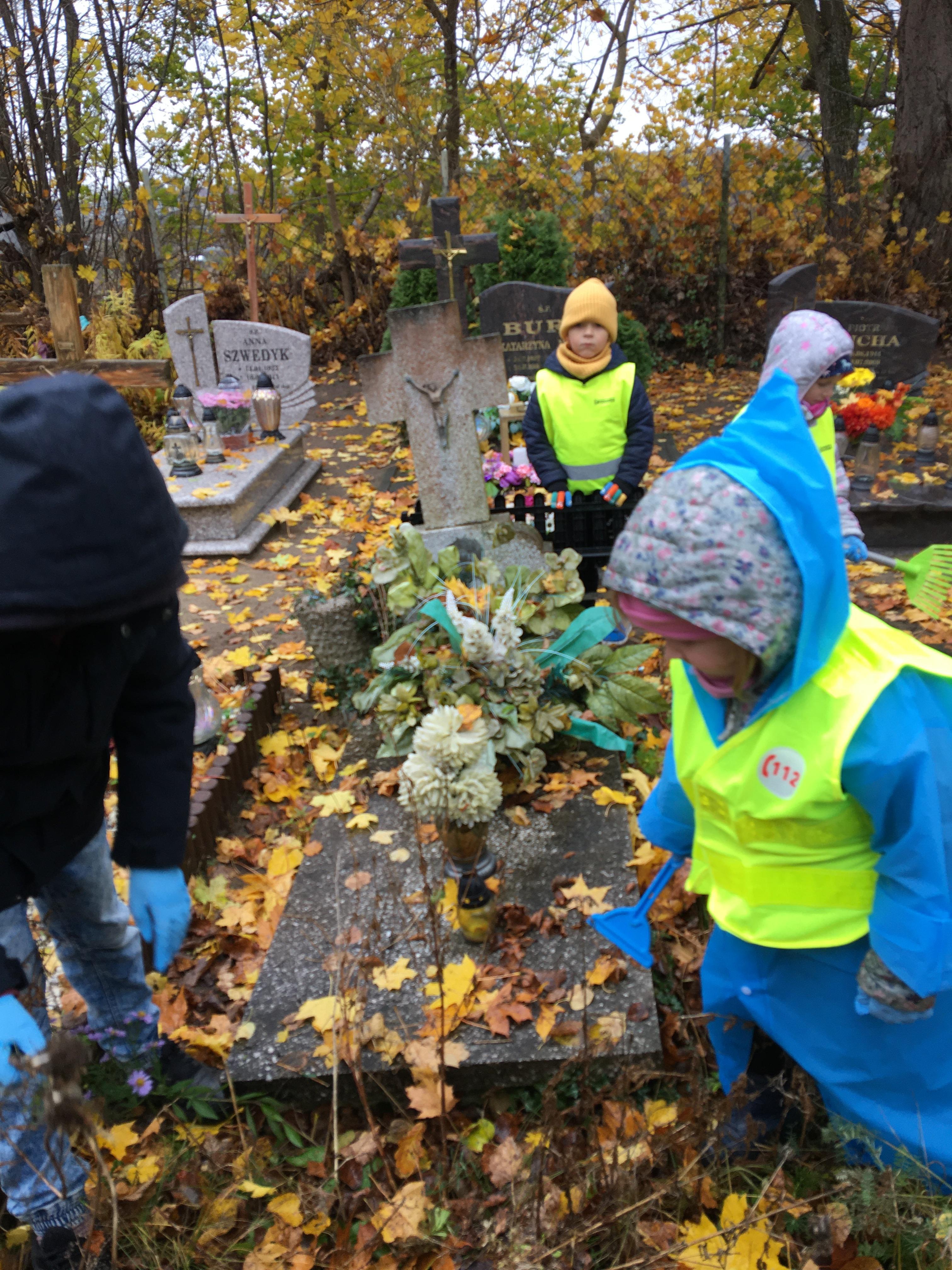 Mimo prawdziwie jesiennej aury grupa uczniów z oddziału przedszkolnego wspierana przez Ewę z klasy ósmej, Oskara z klasy czwartej oraz Adama z klasy siódmej udała się dzisiaj na cmentarz komunalny w Dobrym Mieście, by odnaleźć i uporządkować zapomniany grób i zapalić na nim symboliczny znicz symbolizujący pamięć o tych, którzy odeszli. Postanowiliśmy, iż otoczymy opieką właśnie ten grób z figurką siedzącego aniołka i dawno zatartymi przez czas literami. Chcemy wrócić tutaj wraz z nadejściem wiosny. W drodze powrotnej czas oczekiwania na autobus spędziliśmy w bibliotece CKB, gdzie nawet najmłodsi uczestnicy wyjazdu próbowali swych sił w składaniu literek. I tak potrzebne i pożyteczne połączyło się z przyjemnym.