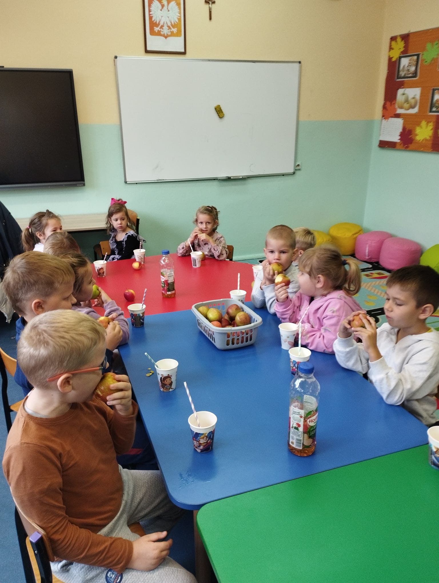 W związku z przypadajacym 24 września Dniem Grzyba wytrawni grzybiarze z oddziału przedszkolnego pomaszerowali do pobliskiego lasu, by pozbierać, to czym hojnie obdarza nas natura jesienią. Wiklinowy kosz, atrybut prawdziwego miłośnika grzybów, stopniowo wypełnił się kolorowymi kapeluszami. Po grzybobraniu i chwili wytchnienia celebrowaliśmy Dzień Jabłka. Bylismy z wizytą w sadzie Pana Henryka, kosztowaliśmy szarlotkę Pani Beaty oraz sok jabłkowy. Było smacznie i zdrowo.