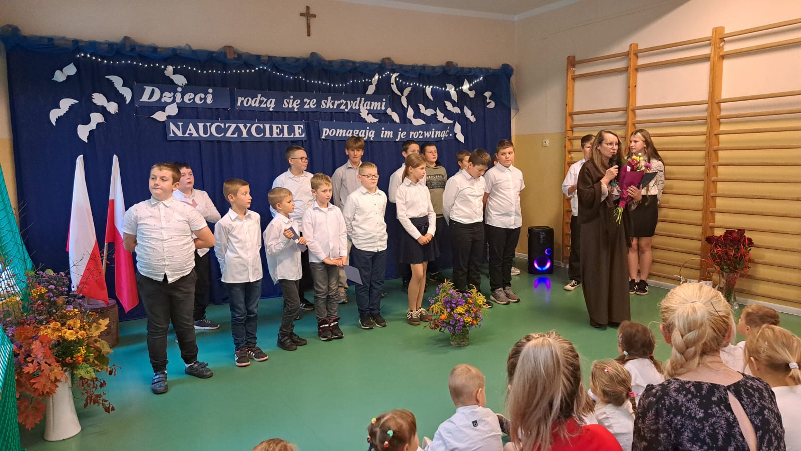Wczoraj nasza Społeczność celebrowała Dzień Edukacji Narodowej – święto wszystkich pracowników oświaty. W uroczystości uczestniczyły Pani Beata Harań  – Burmistrz Dobrego Miasta oraz Pani Aneta Pawtel Kierownik Referatu Oświaty, Kultury, Sportu i Spraw Społecznych. Podczas apelu usłyszelismy słowa podziękowań za trud, cierpliwość i życzliwość. Wszystkim pracownikom Zientarówki składamy najserdeczniejsze życzenia. Duzo zdrowia, siły i satysfakcji z wykonywanej pracy!