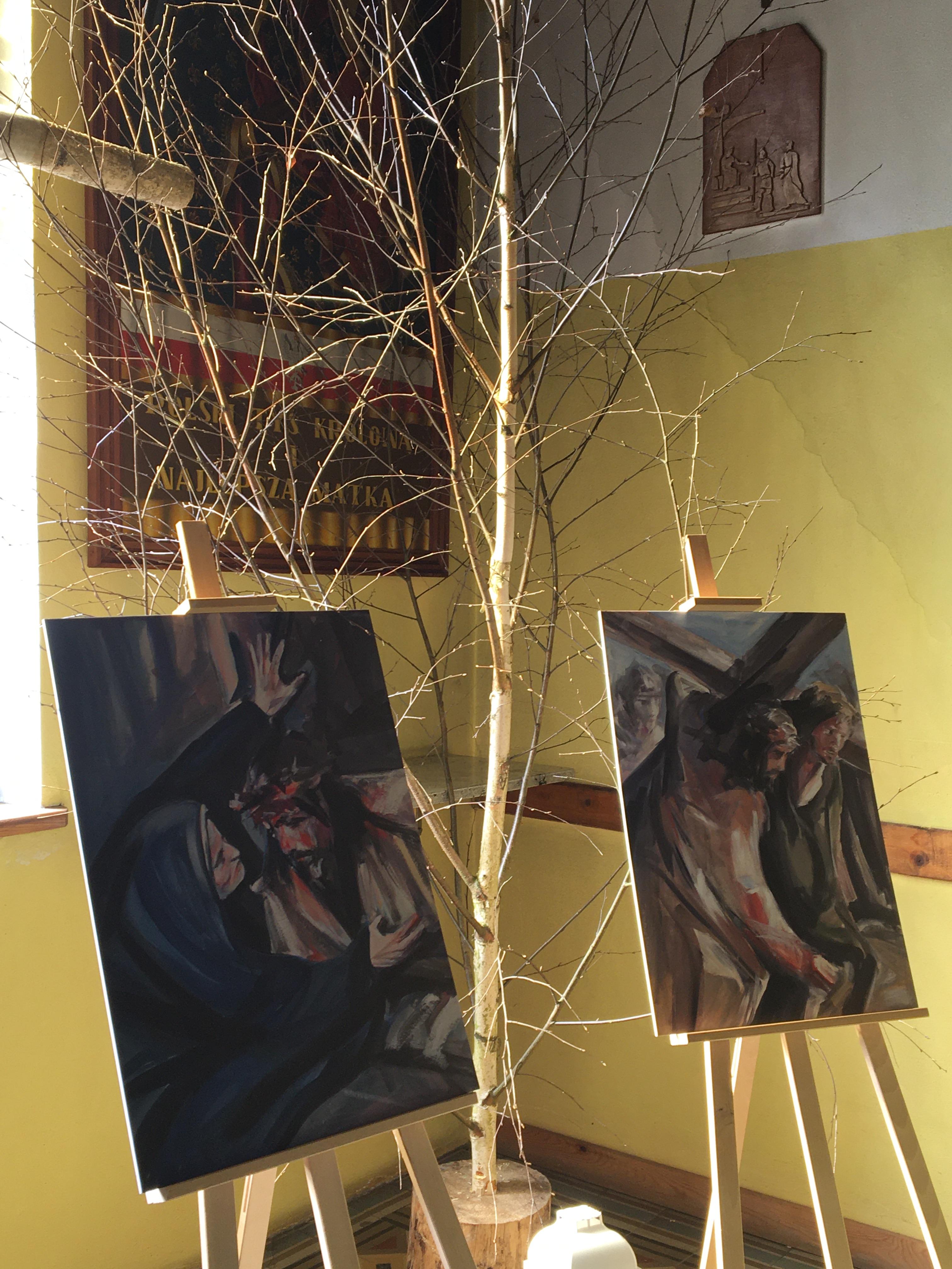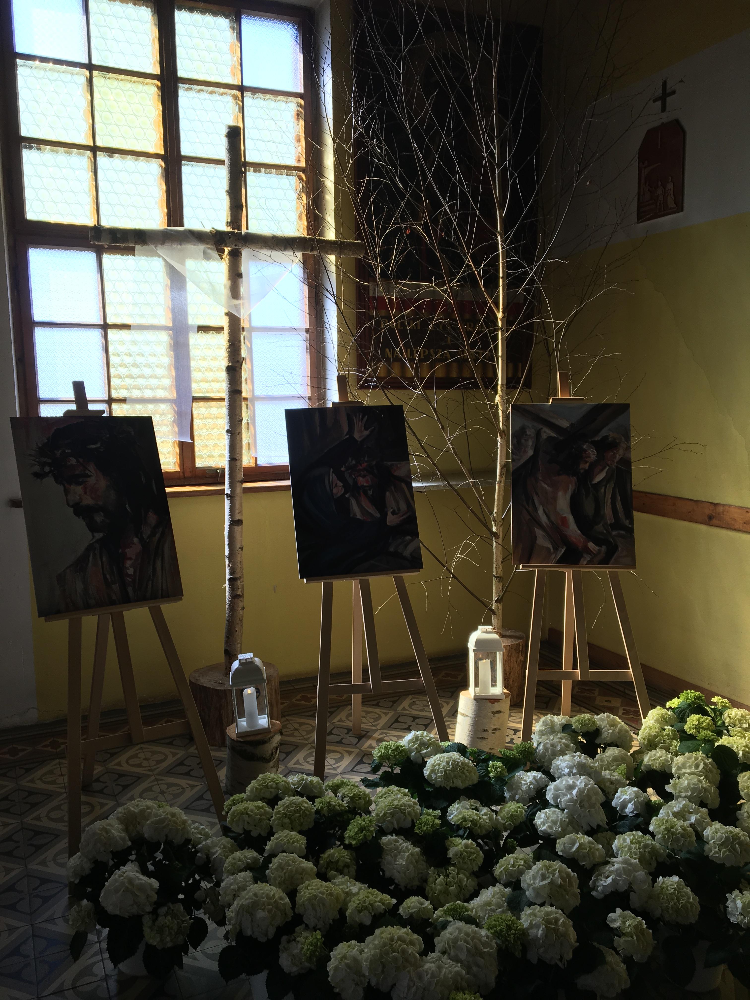 Wielki Tydzień w religii chrześcijańskiej jest czasem przeżywania tajemnic paschalnych, które obejmują mękę, śmierć, zmartwychwstanie i wniebowstąpienie Jezusa. Jak w roku ubiegłym, tak i teraz Społeczność Zientarówki we współpracy z kołem różańcowym przygotowała Grób Pański w barcikowskim kościele. Obrazy, które go tworzą przedstawiają Jezusa i towarzyszące Mu w drodze cierpienia postaci - św. Weronikę i Szymona Cyrenejczyka. Tryptyk, stanowi jedynie fragment całości malarskiej wizji Drogi Krzyżowej artysty Mariusza Arsoby. Cierpienie Chrystusa, miłosierdzie św. Weroniki ocierającej Jego twarz z krwi i potu oraz solidarność św. Szymona dźwigającego krzyż są uniwersaliami, które znajdują miejsce róznież w  naszym życiu. Tu i teraz - zmagamy się z cierpieniem - własnym i naszych bliskich. Współczujemy i doznajemy współczucia. Przyjmujemy niechciane trudy. Doświadczamy daru narodzin, ale i śmierci. Naszym udziałem staje się smutek odejścia, ale także nadzieja, która jest zapowiedzią odrodzenia.Niech przeżywanie tajemnic paschalnych stanie się udziałem w radości Niedzieli Zmartwychwstania Pańskiego!