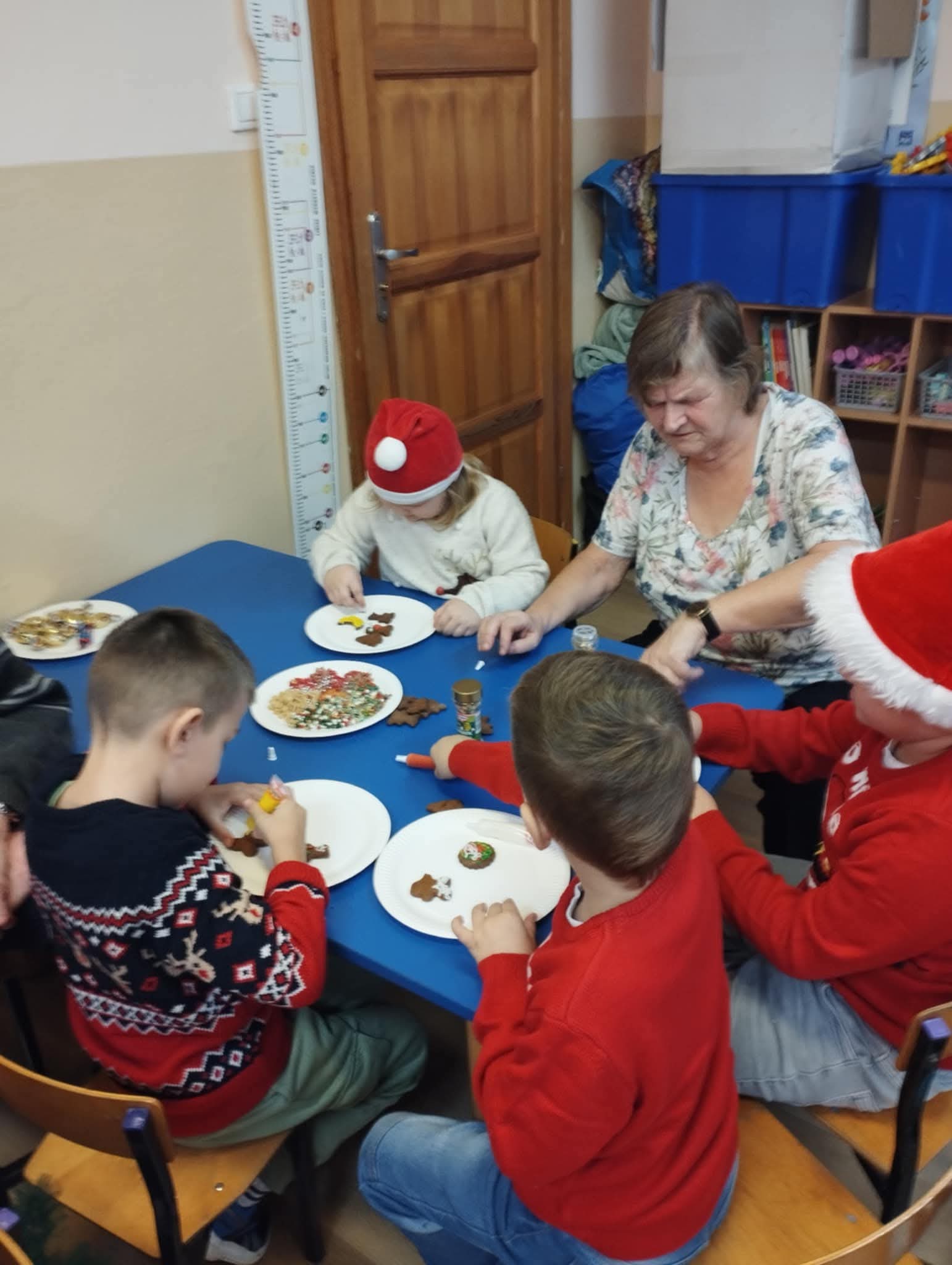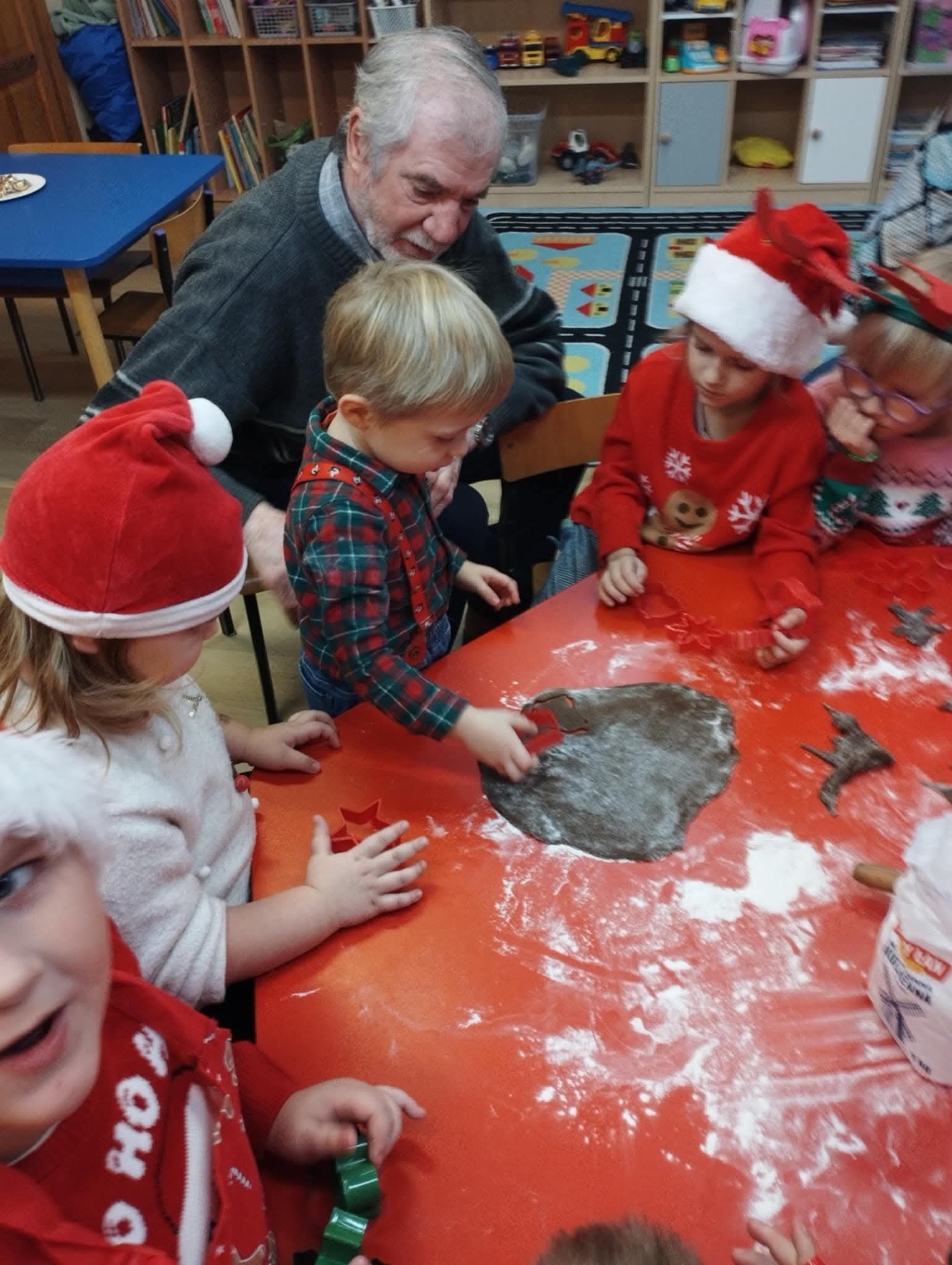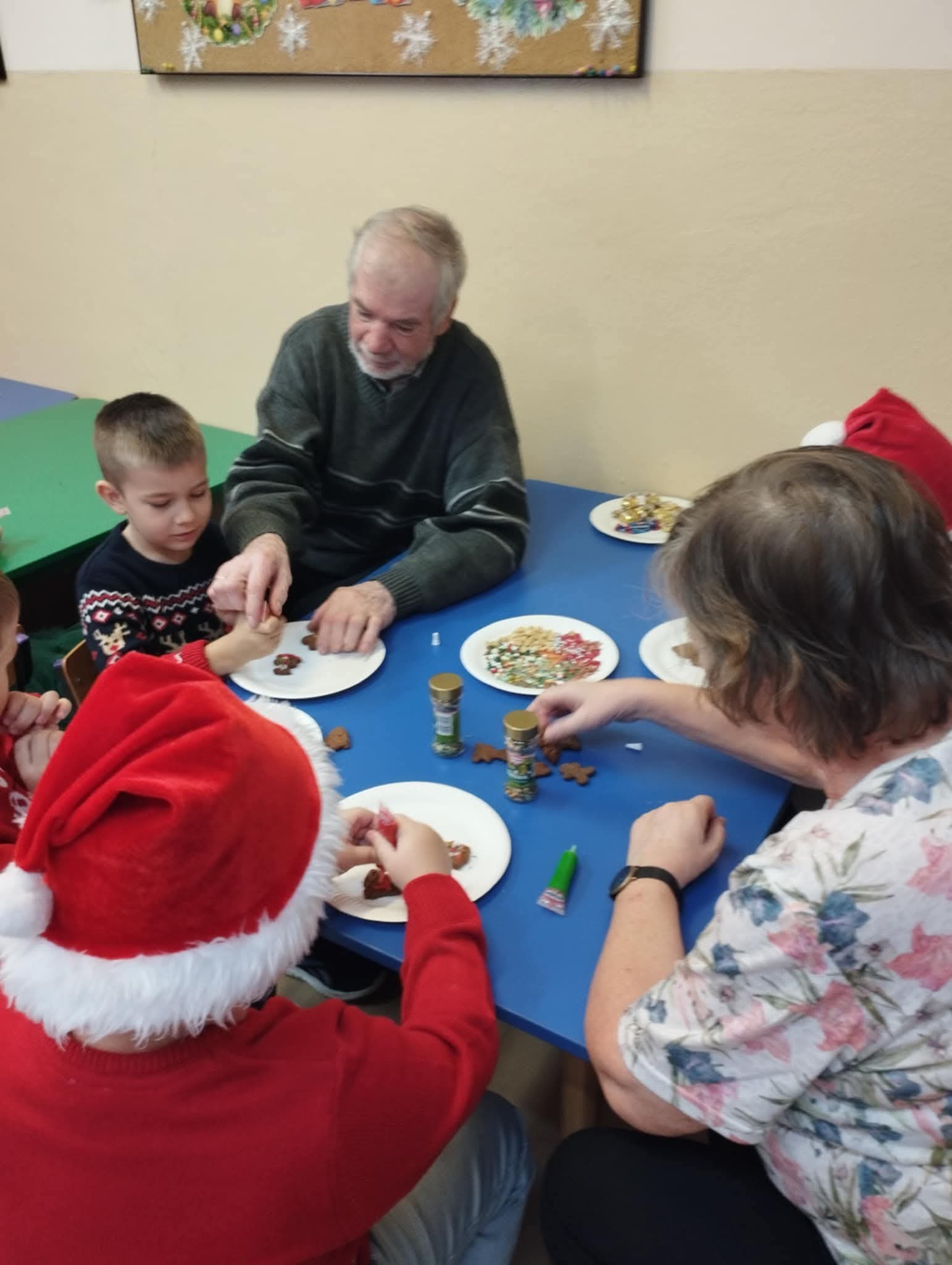 W naszym przedszkolu odbyły się wyjątkowe warsztaty pieczenia świątecznych pierniczków. Dzieci do kulinarnej zabawy zaprosiły swoje kochane babcie, a gościnnie towarzyszył im również jeden z dziadków. Przedszkolaki wraz z seniorami wałkowały ciasto, wykrawały świąteczne kształty oraz ozdabiały pierniczki kolorowymi lukrami i posypkami. Zapach pieczonych pierników szybko wypełnił całe przedszkole, a gotowe wypieki wyglądały jak małe dzieła sztuki. Kochani Dziadkowie, z całego serca dziękujemy za Waszą obecność, ciepło i wielkie serce.