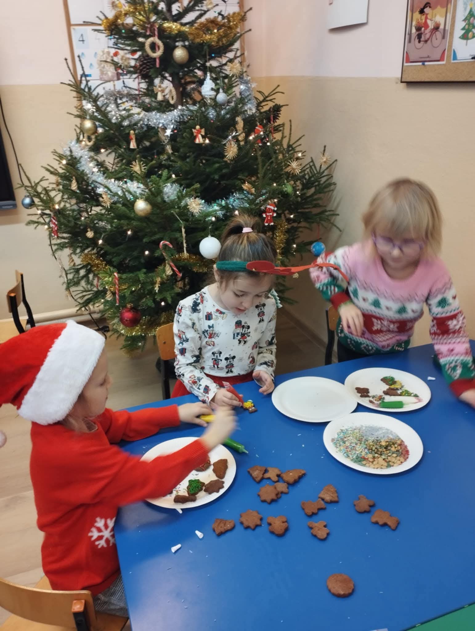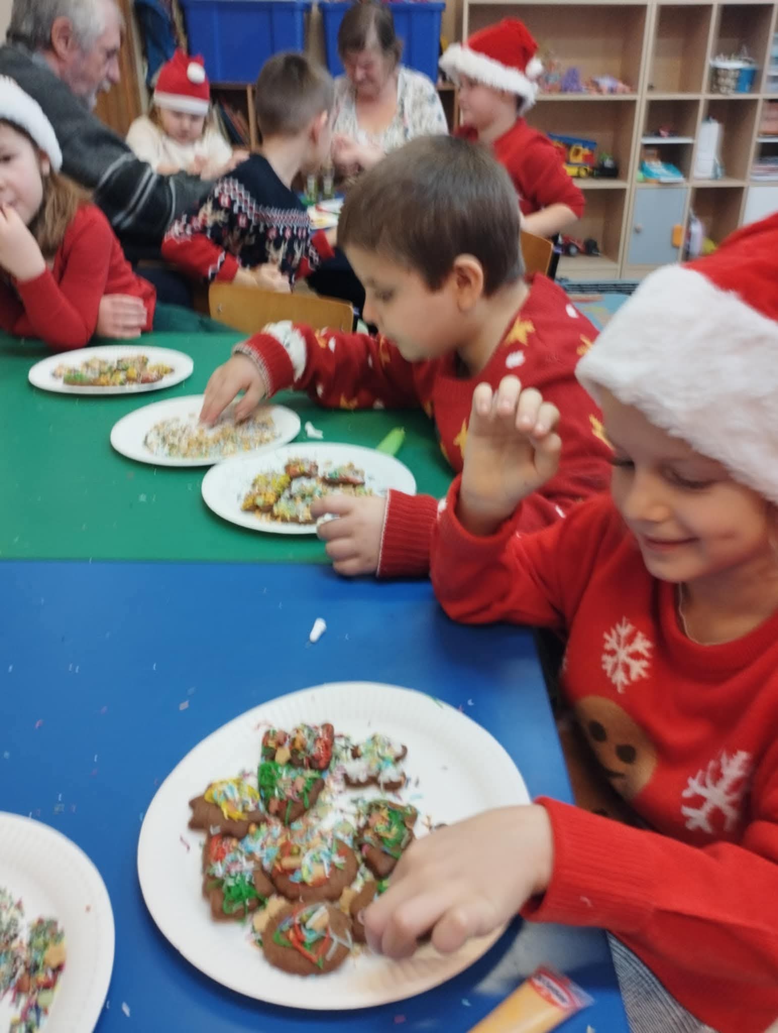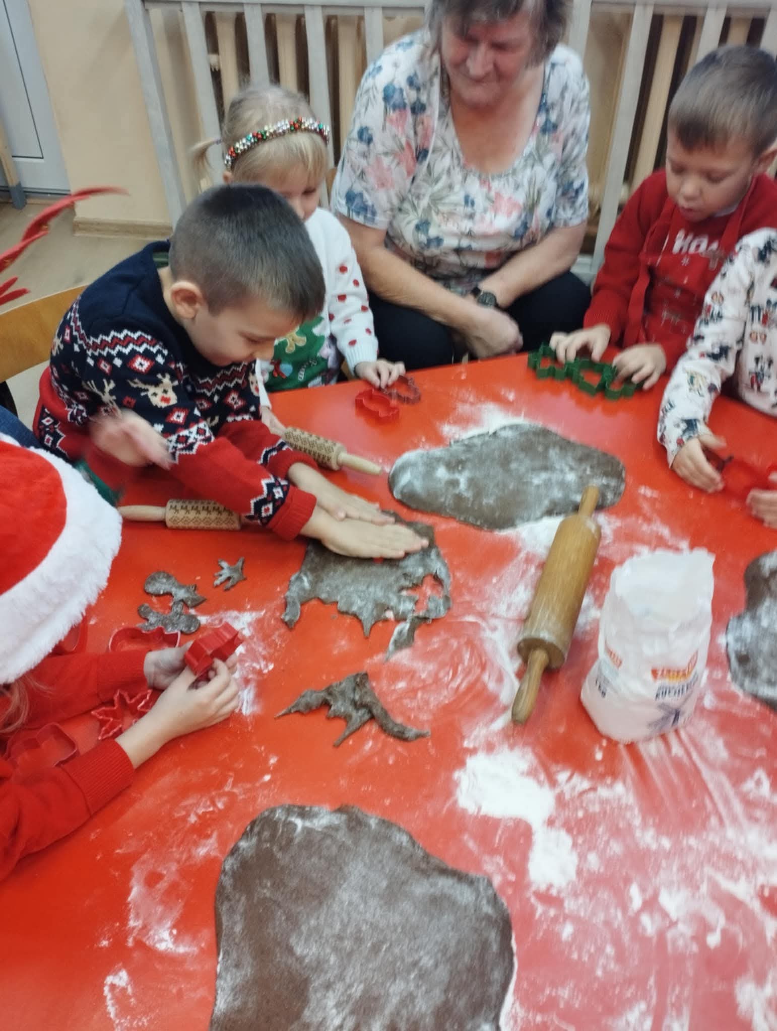 W naszym przedszkolu odbyły się wyjątkowe warsztaty pieczenia świątecznych pierniczków. Dzieci do kulinarnej zabawy zaprosiły swoje kochane babcie, a gościnnie towarzyszył im również jeden z dziadków. Przedszkolaki wraz z seniorami wałkowały ciasto, wykrawały świąteczne kształty oraz ozdabiały pierniczki kolorowymi lukrami i posypkami. Zapach pieczonych pierników szybko wypełnił całe przedszkole, a gotowe wypieki wyglądały jak małe dzieła sztuki. Kochani Dziadkowie, z całego serca dziękujemy za Waszą obecność, ciepło i wielkie serce.